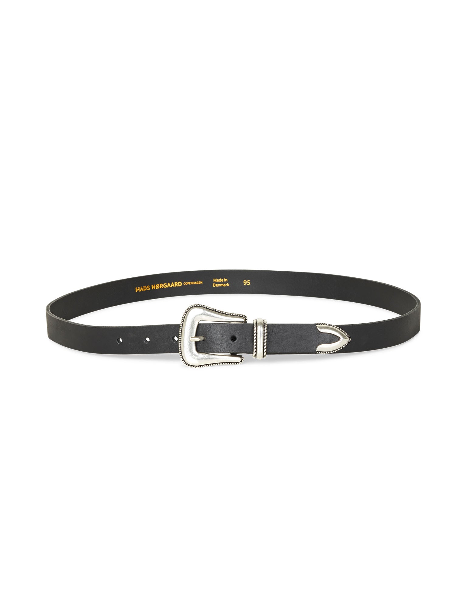 Smooth leather belt with metal buckle.