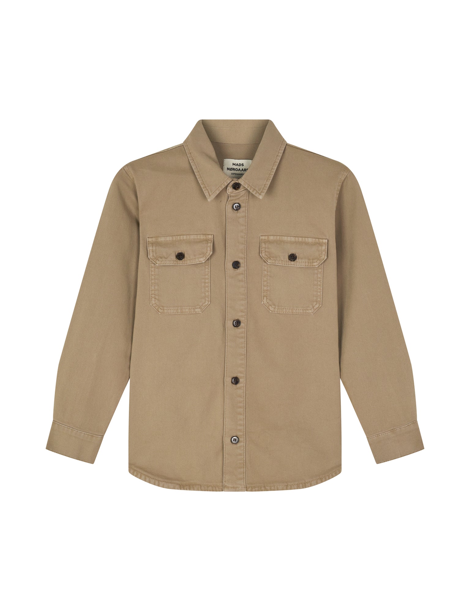 The Soft Canvas Sterno Shirt is a slightly oversized, relatively straight up and down cargo-style shirt with two sealed chest pockets and a turn-down collar.