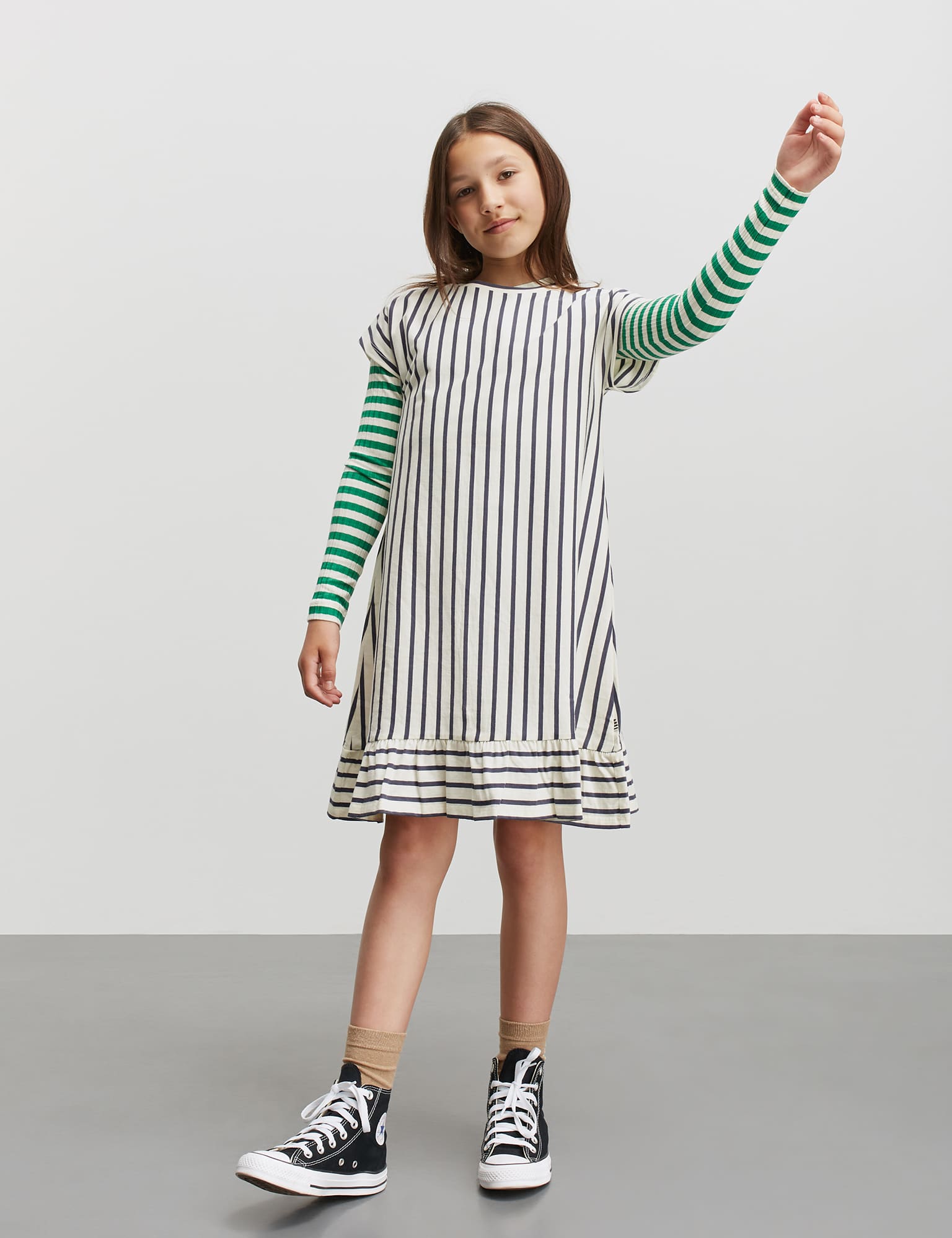 The Soft Single Dreamina dress is a dreamy T-shirt dress in organic cotton. It features an airy A-line shape with vertical stripes, ruffles at the bottom with horizontal stripes, and sleeves so short they're barely there.