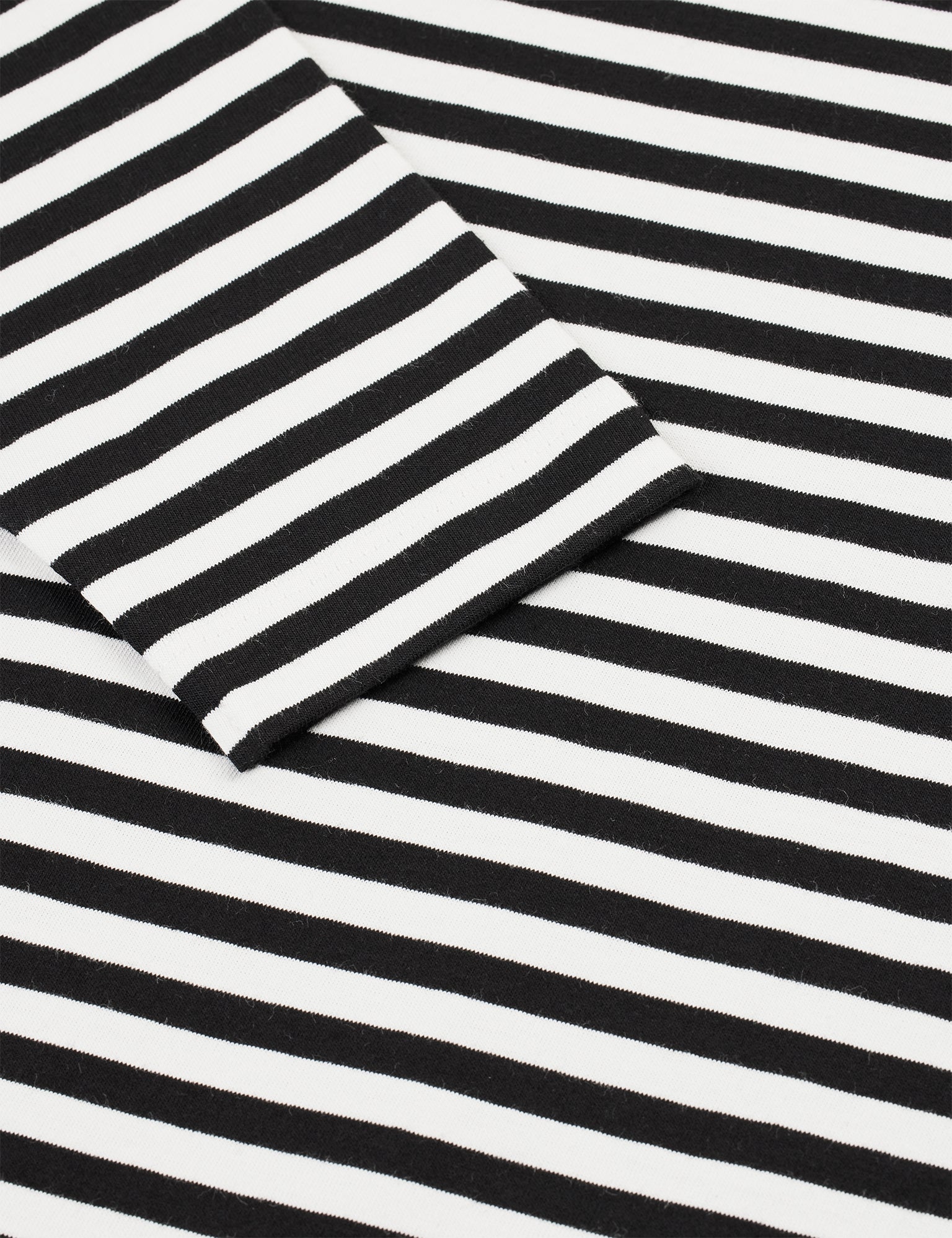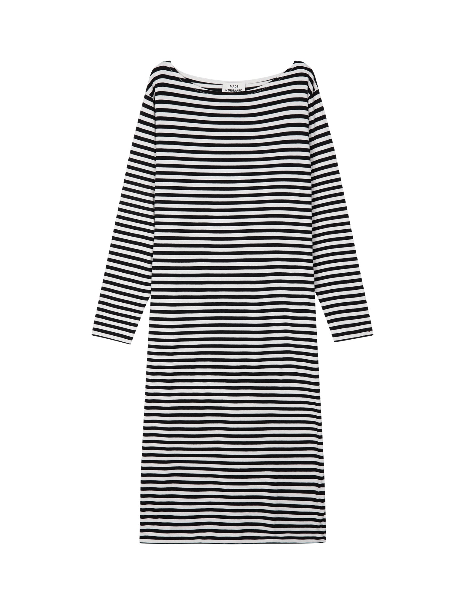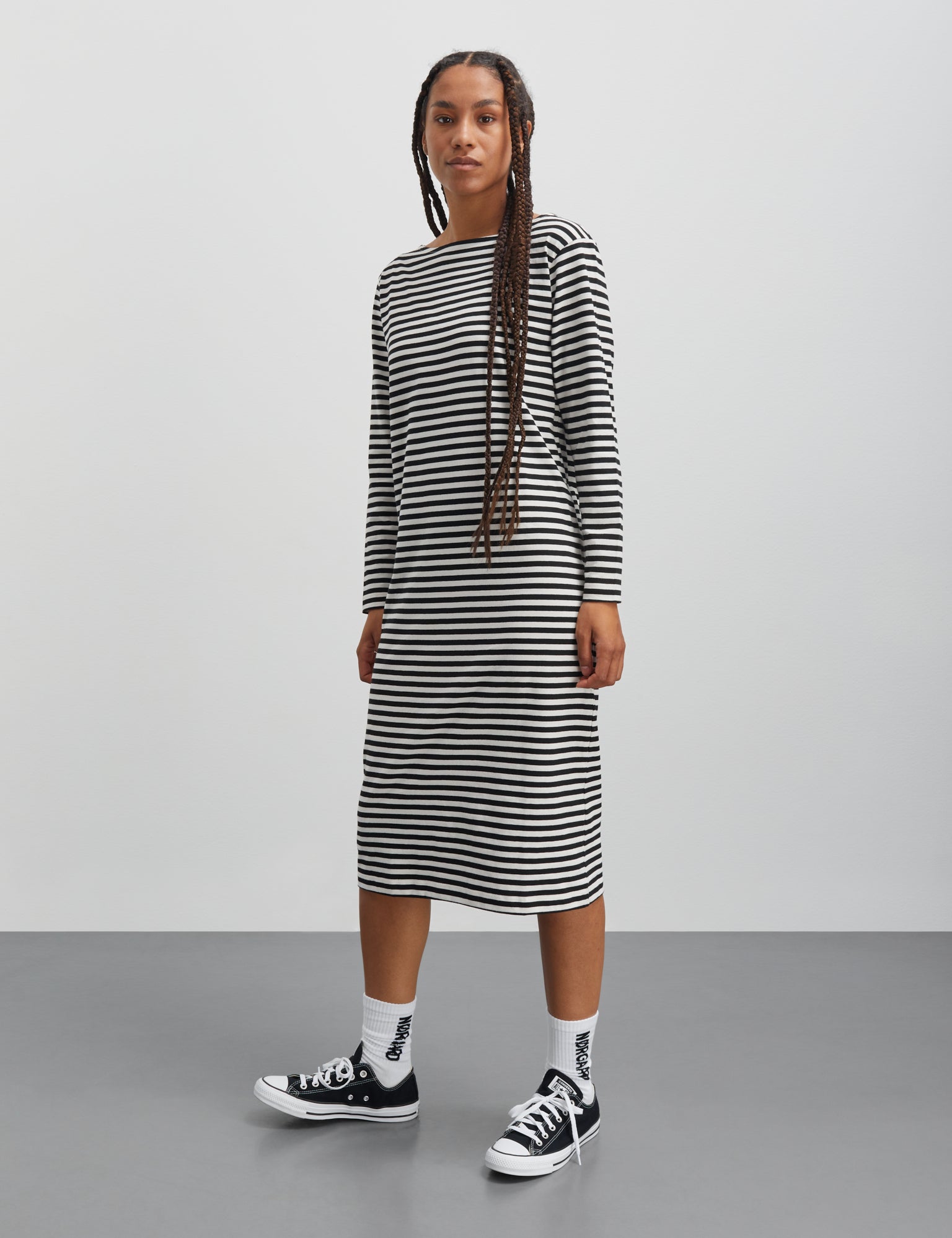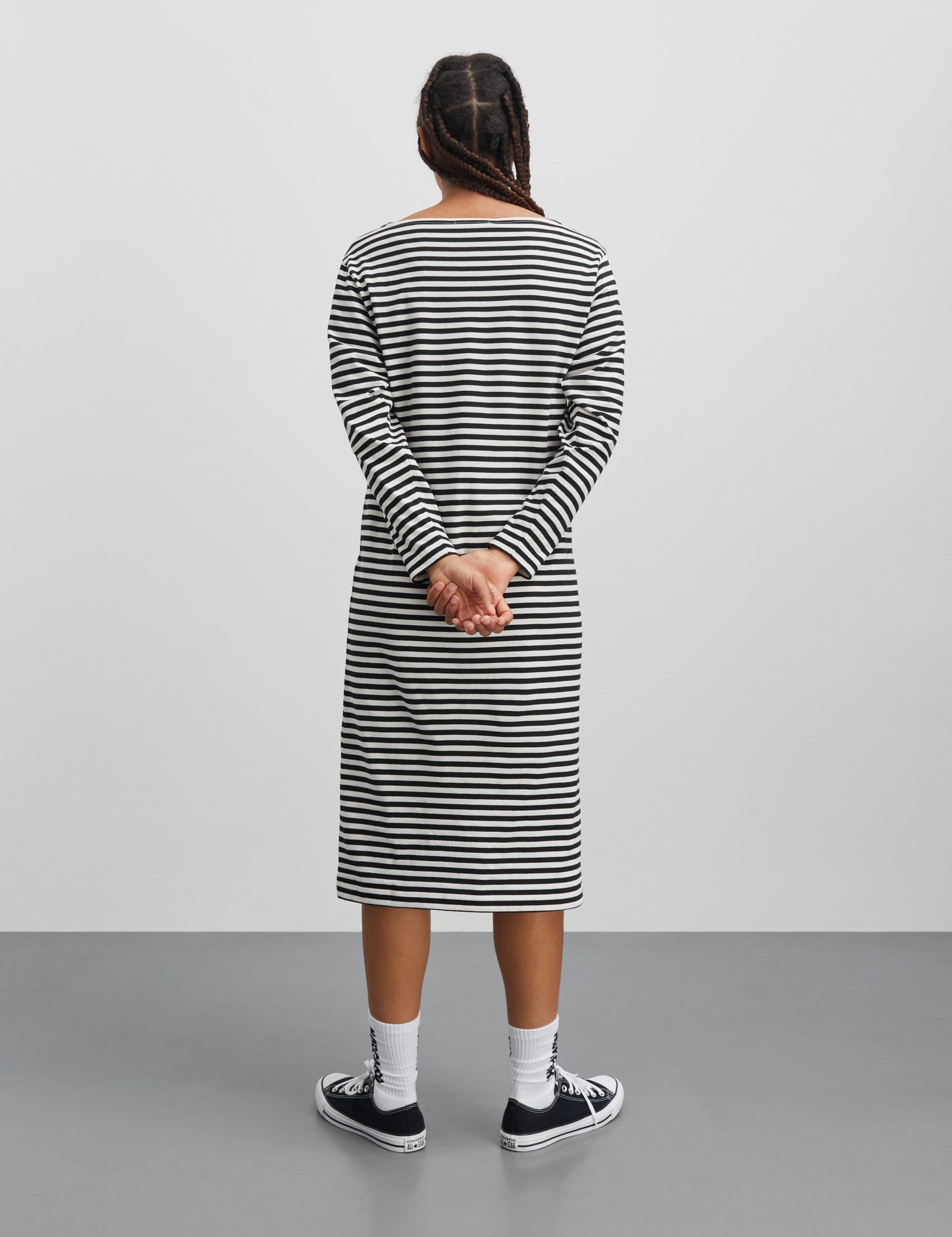 Our long-sleeved T-shirt dress Soft Single Stripe Silas Dress is made of 100 % organic cotton. The fit is relaxed regular, the neck has a boat neckline and the length is below the knee.