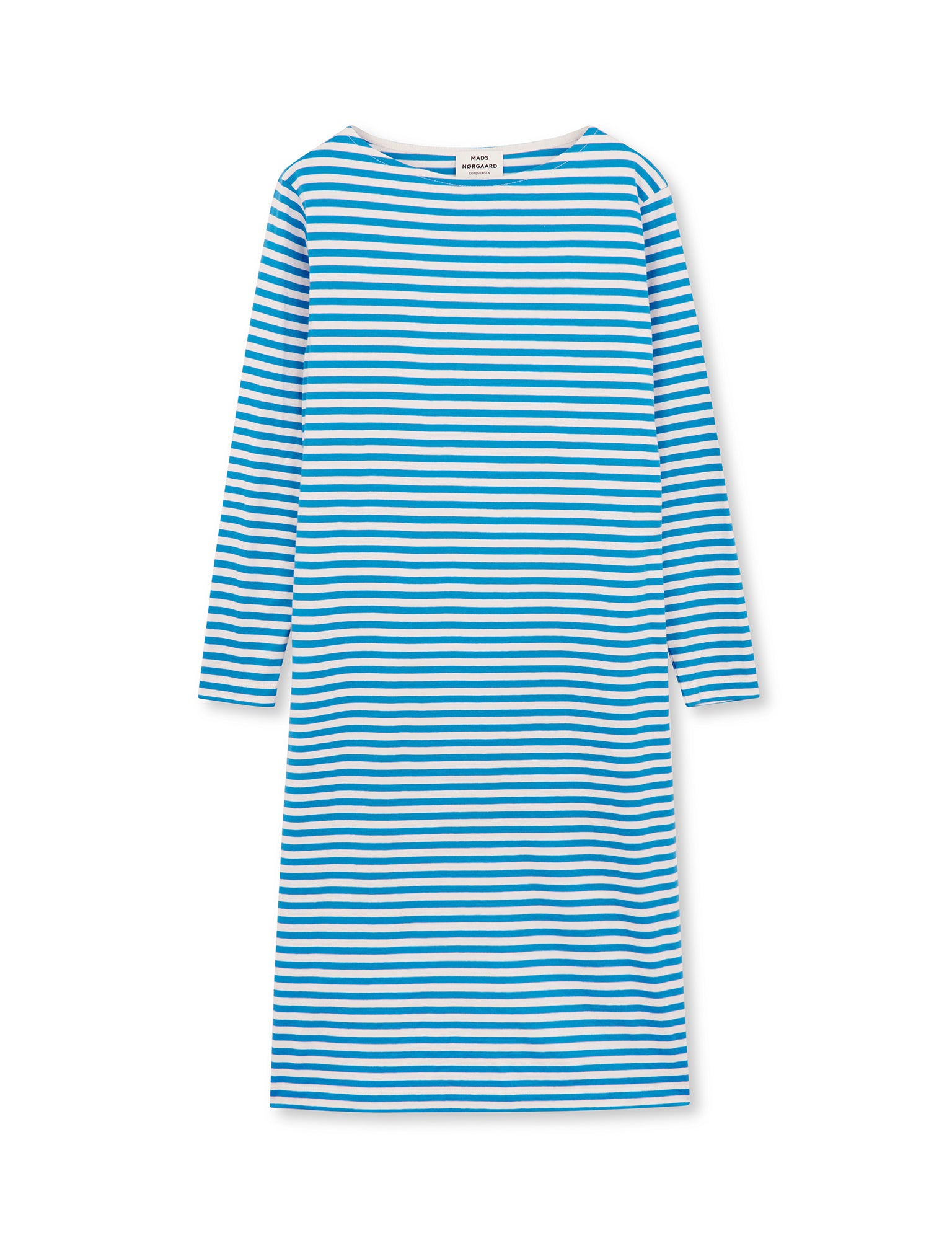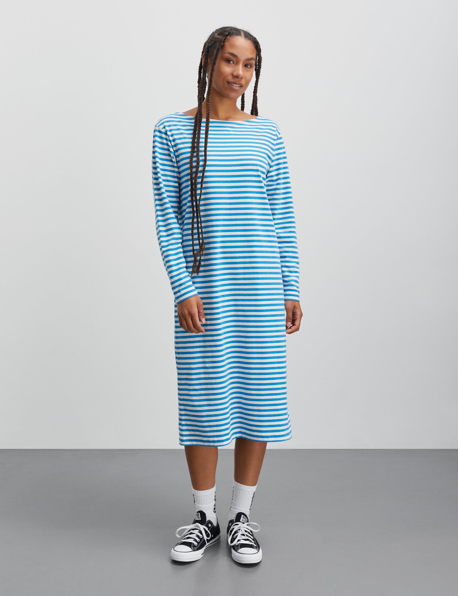 Our long-sleeved T-shirt dress Soft Single Stripe Silas Dress is made of 100 % organic cotton. The fit is relaxed regular, the neck has a boat neckline and the length is below the knee.