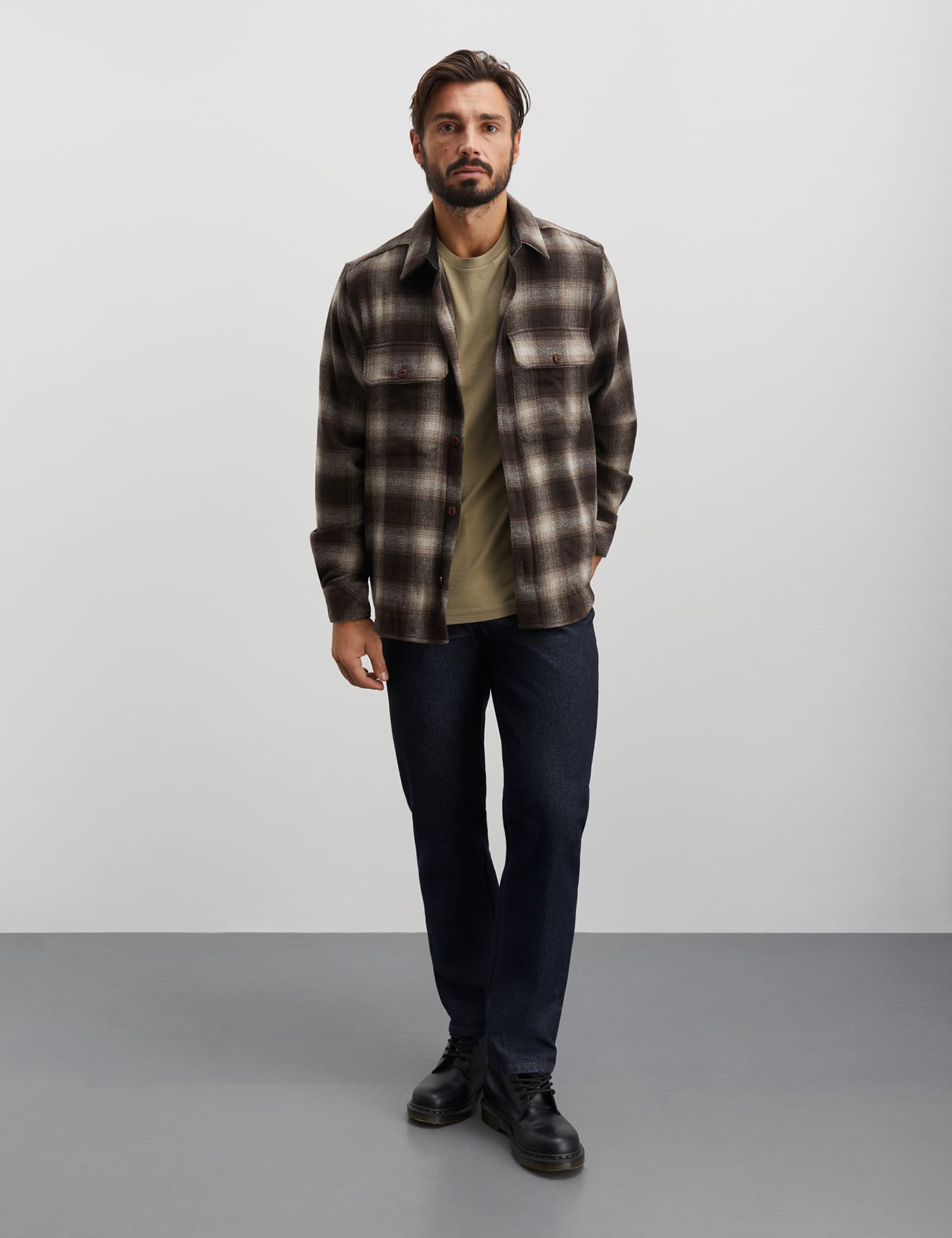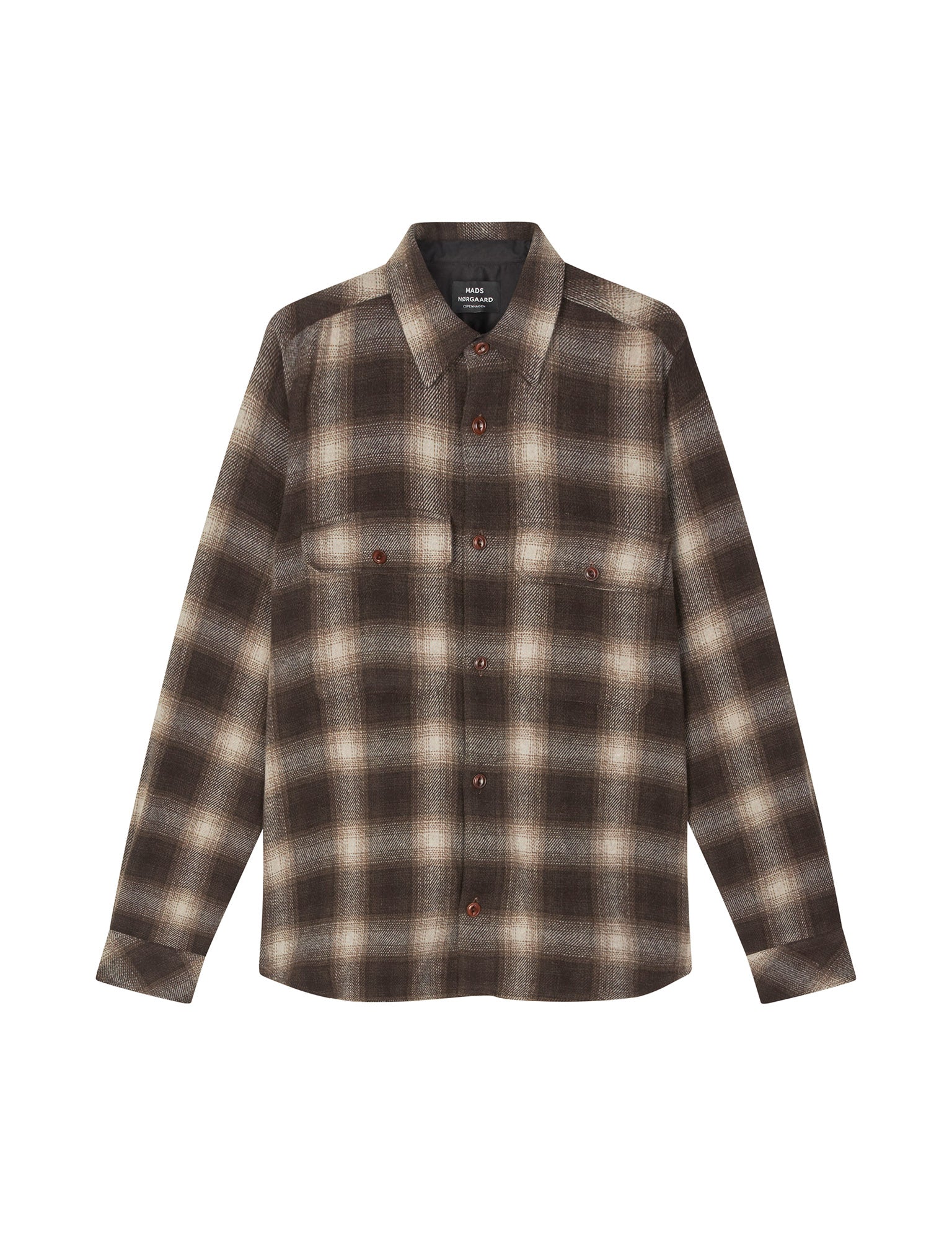 Soft Wool Noah Check is a warm and woollen overshirt. It has a loose and relaxed fit, two sealed breast pockets, tartan, and a turn-down collar.