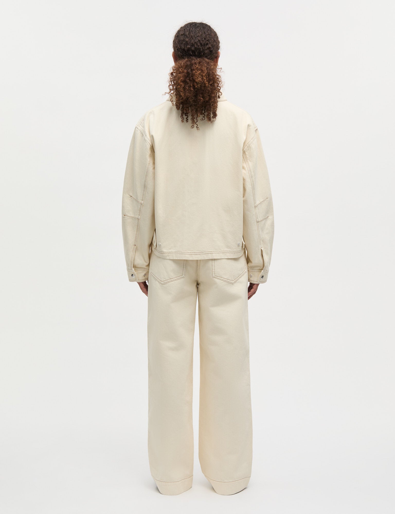 Short and structured denim jacket with collar, concealed button fastening, visible stitching and large patch front pockets.