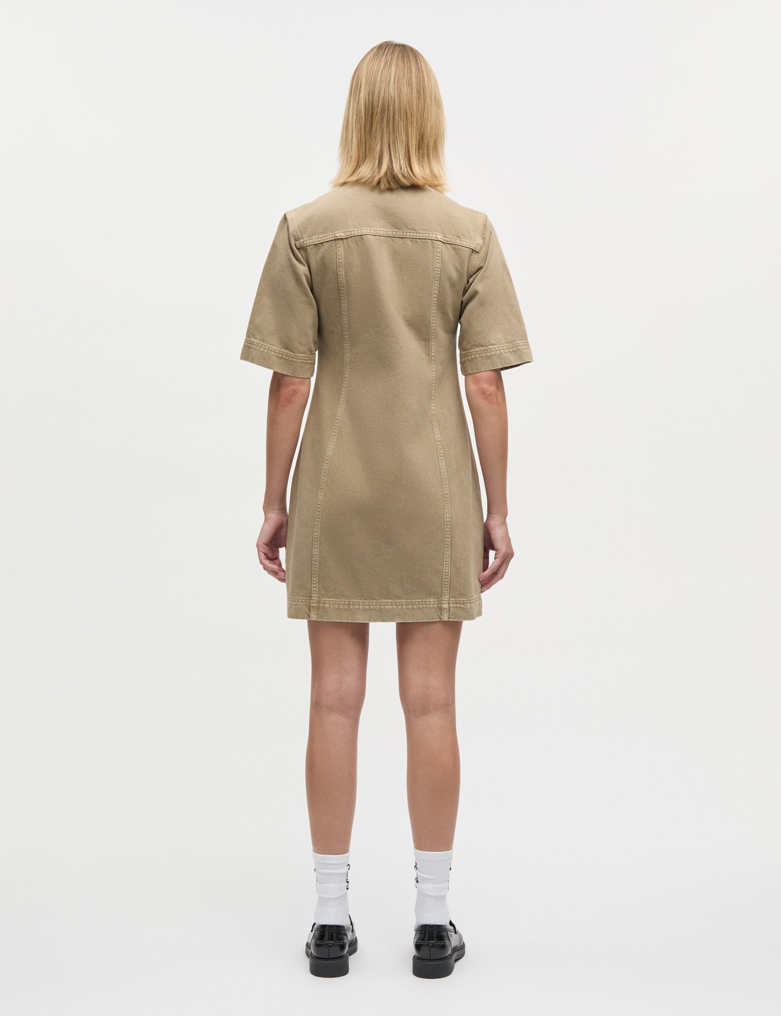 Short denim dress with a V-neck, mid-length sleeves, fitted panels and a full button fastening at the front.