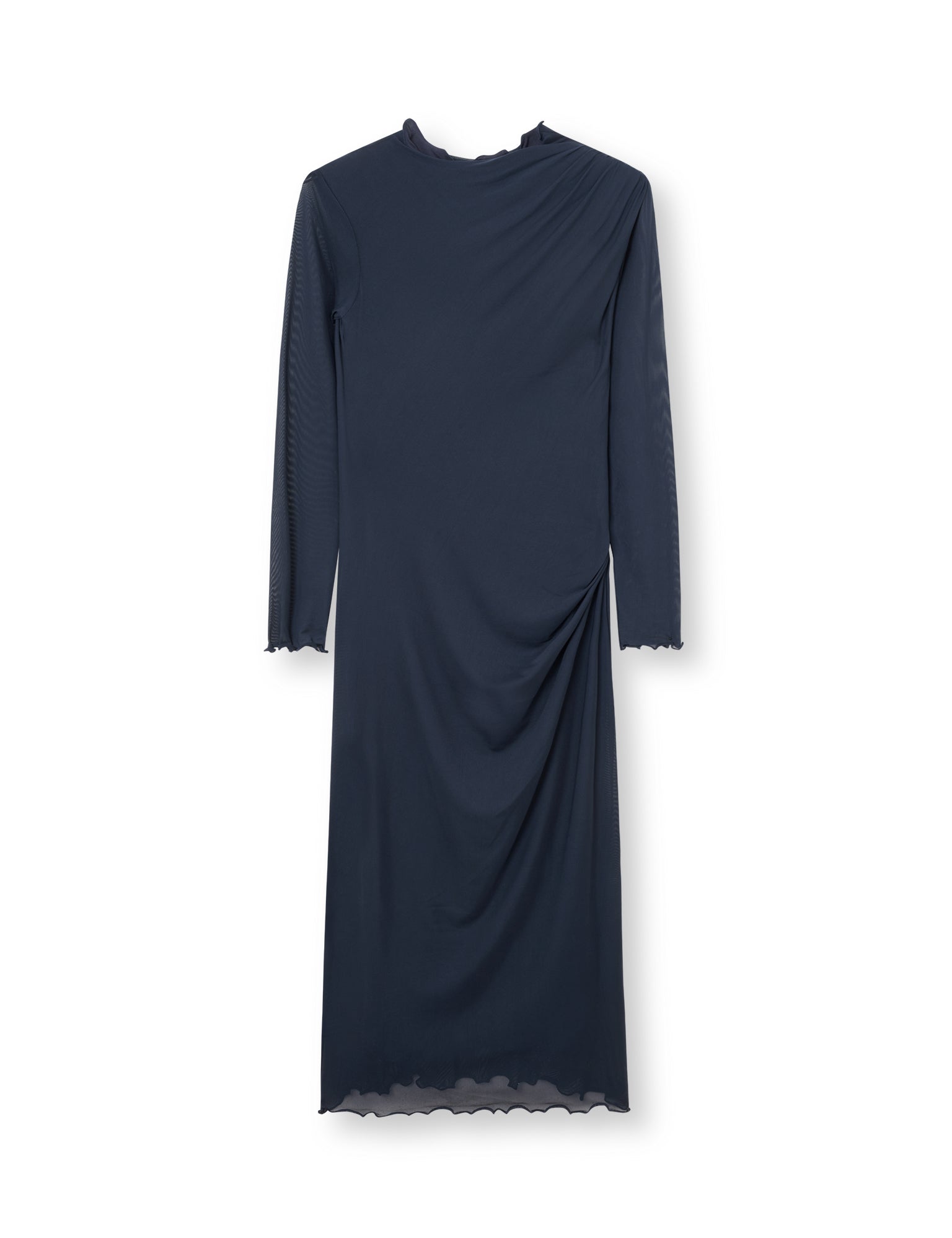 The Stretch Mesh Fia dress is body-hugging with a semi-high neck, long-sleeves and is calf-length.