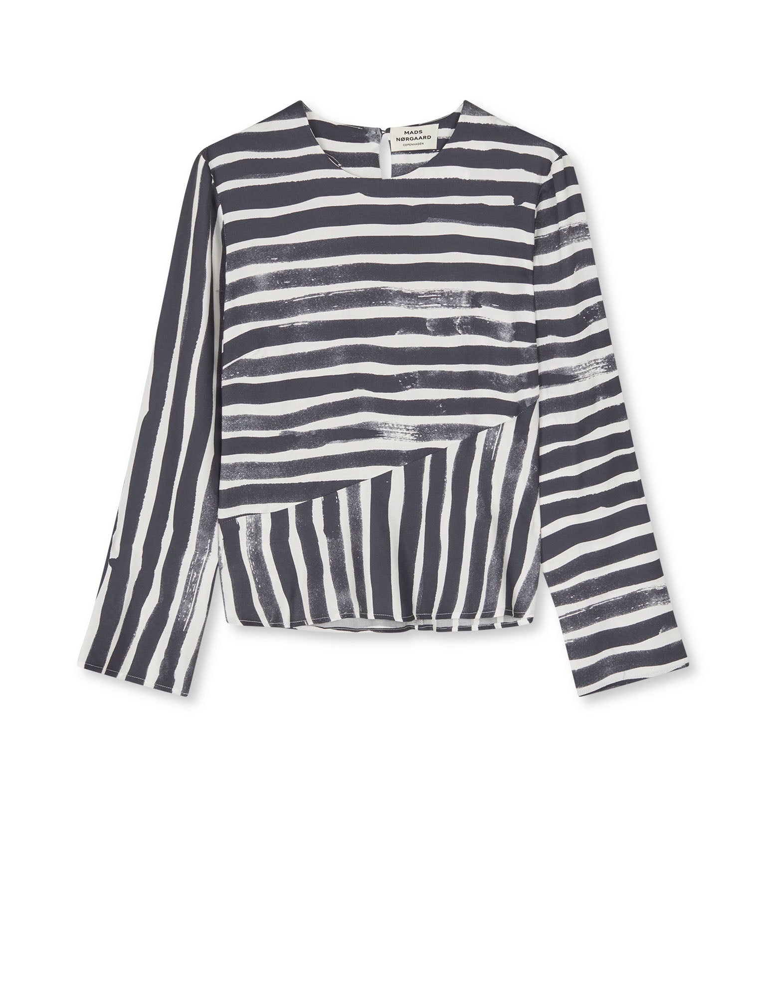 The long-sleeved Tencella Ava Top is lightweight and soft, featuring an A-line shape, a neck fastening, and a diagonal seam across the belly.