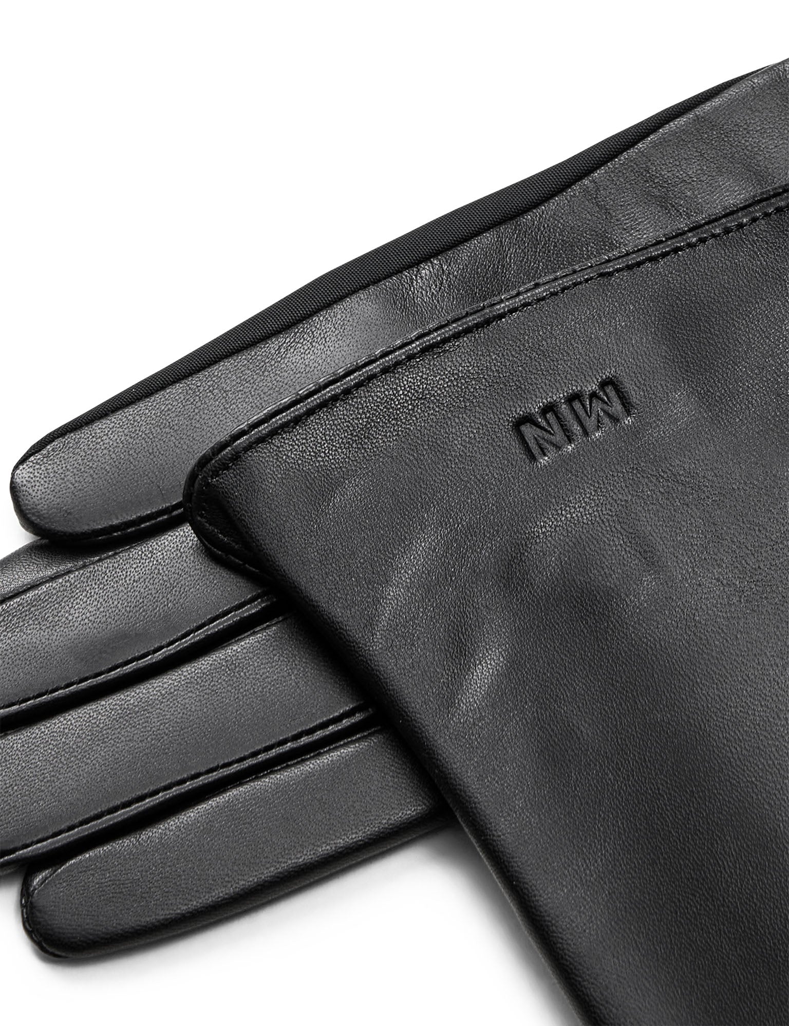 Gloves with soft leather on the back of the hand and soft, flexible fabric on the palm.