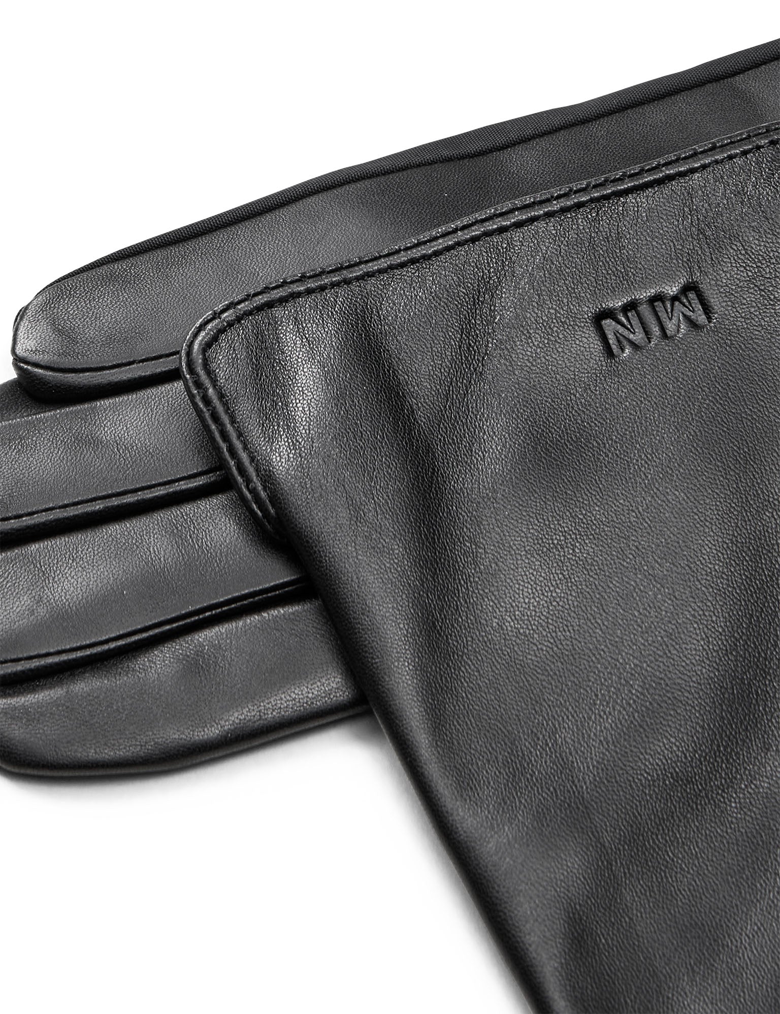 Long gloves with soft leather on the back of the hand and soft, flexible fabric on the palm.