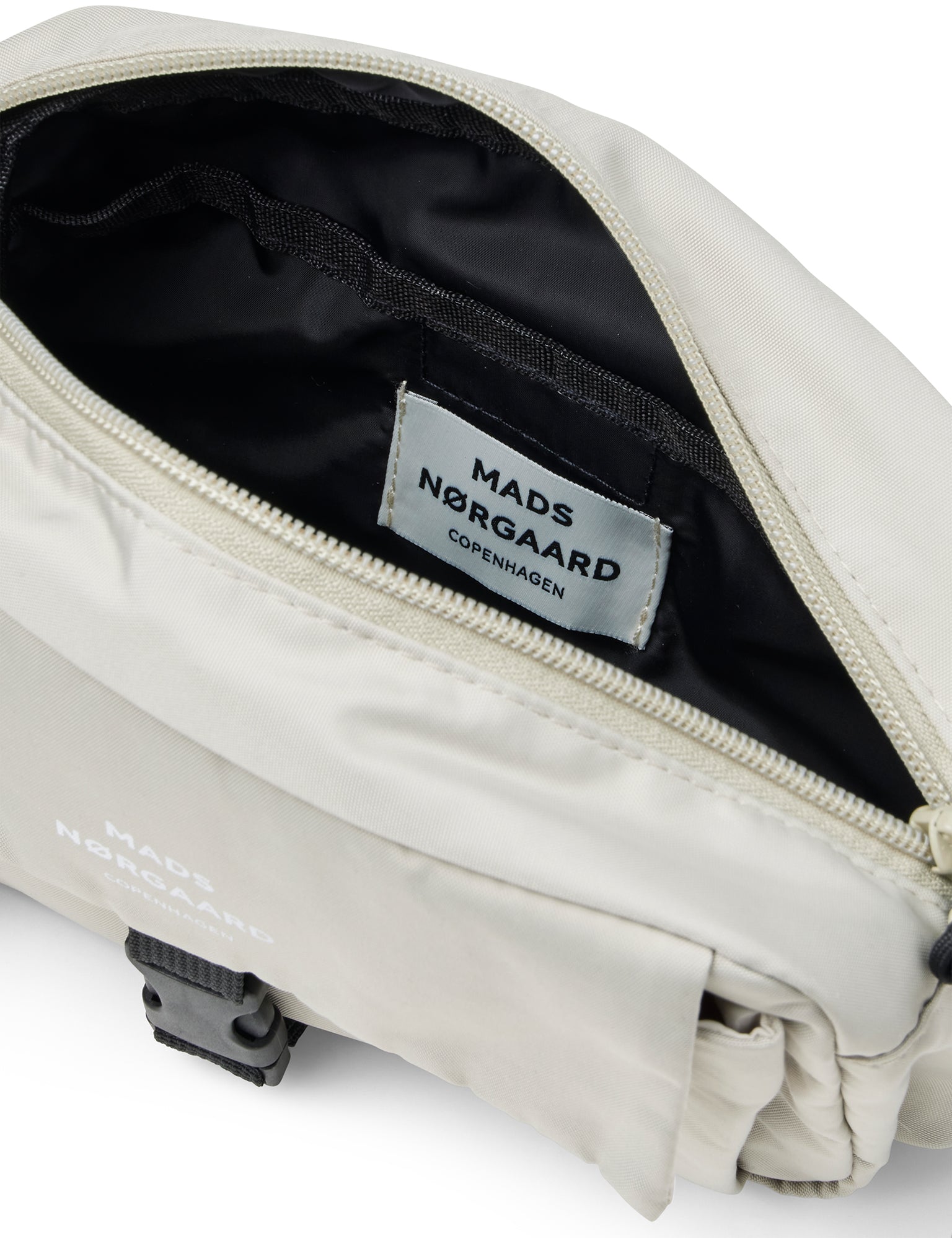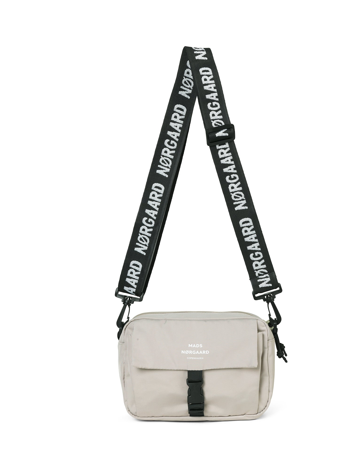 The Tian Fae Bag is a crossbody bag with an adjustable and detachable logo shoulder strap. The bag closes with a zip and has both an outer and an inner pocket, each with a different type of closure.
