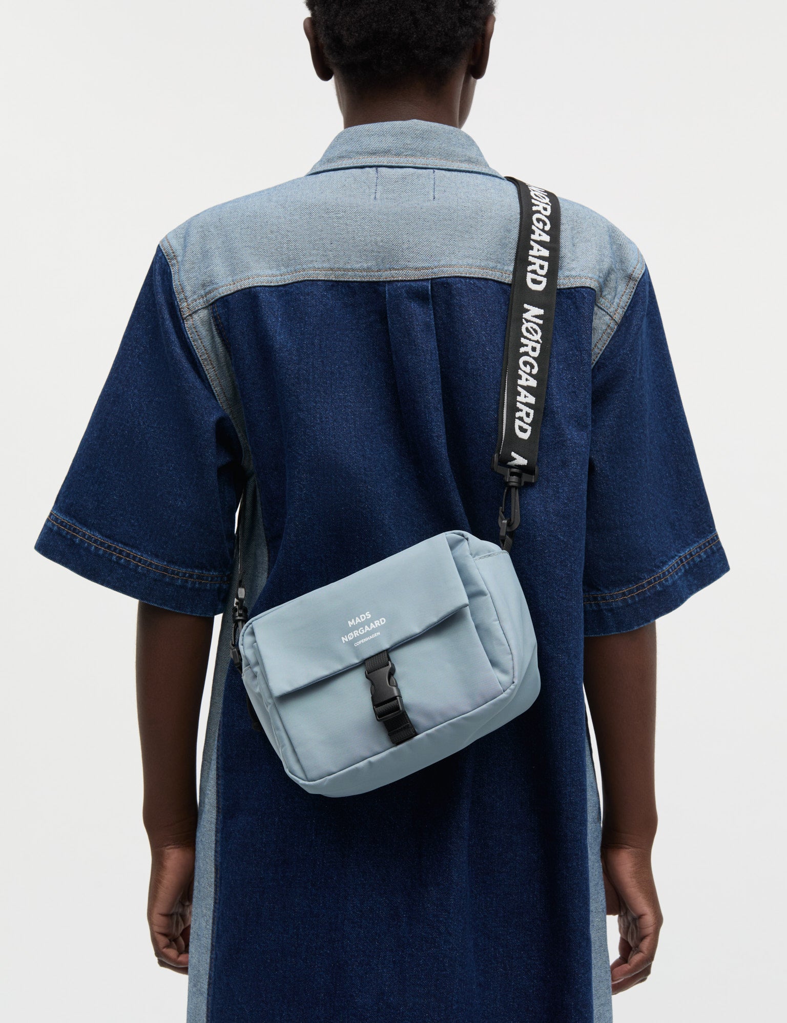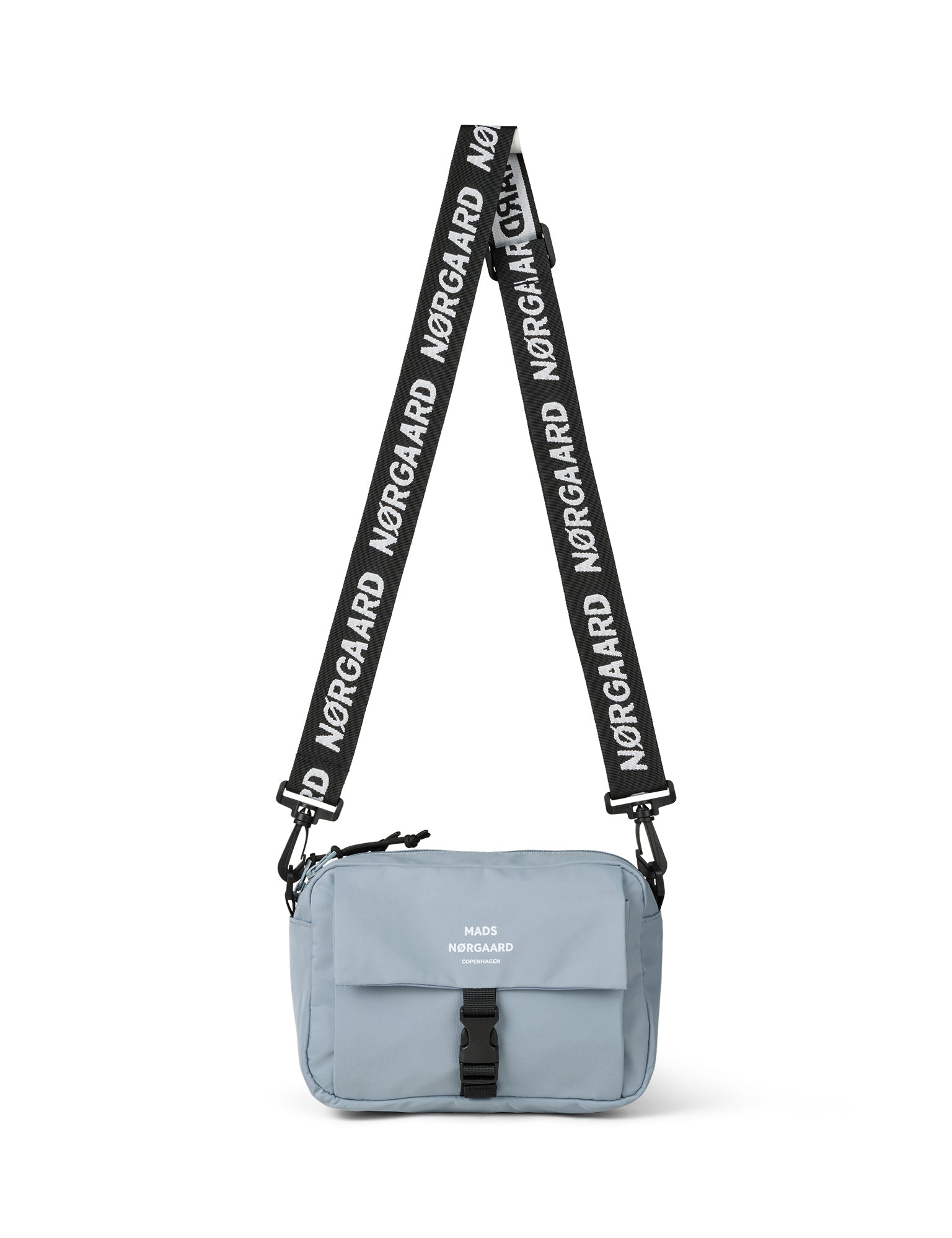 Crossbody bag with a wide, adjustable and detachable logo strap, zip closure, an inner pocket, and an external pocket with a snap buckle.