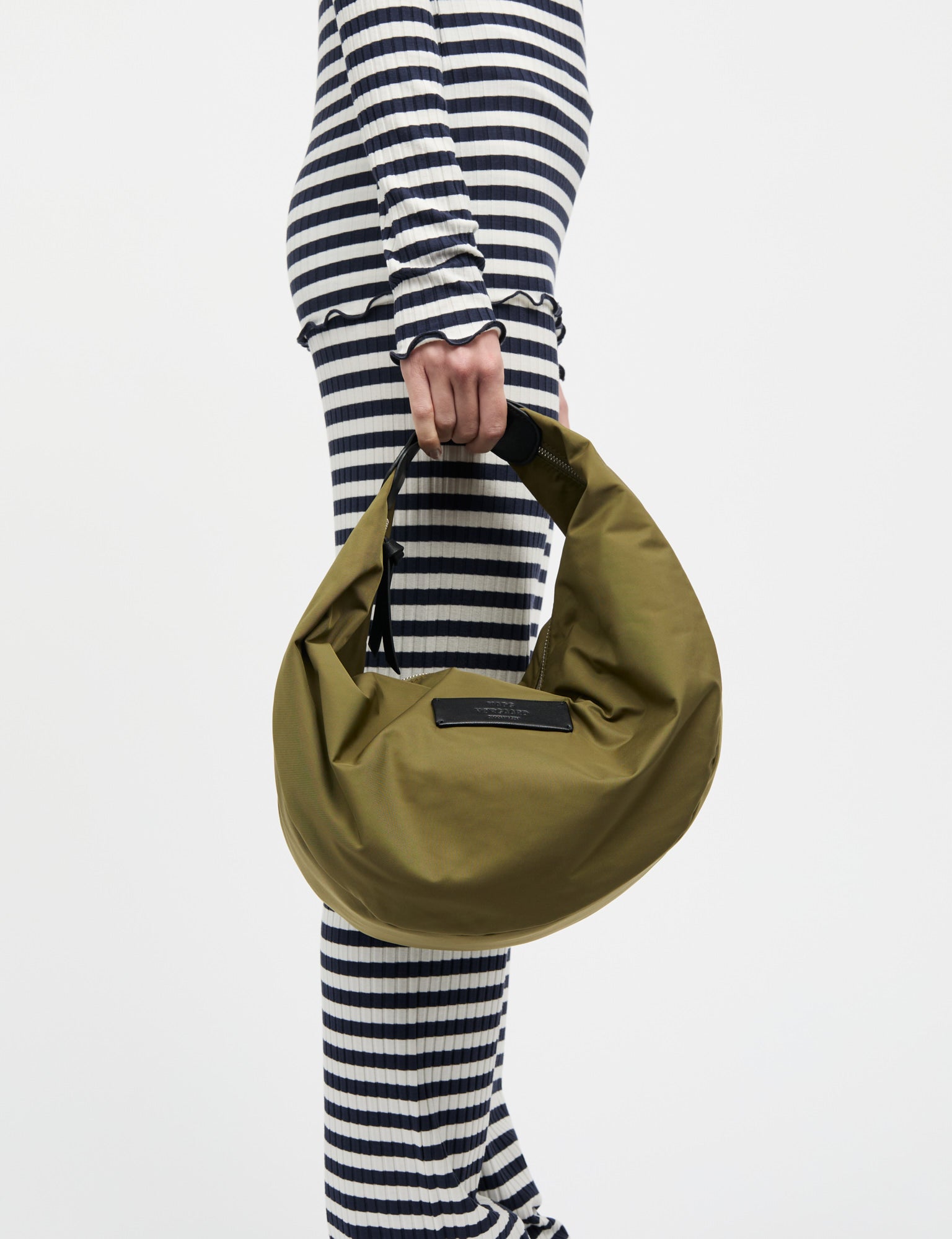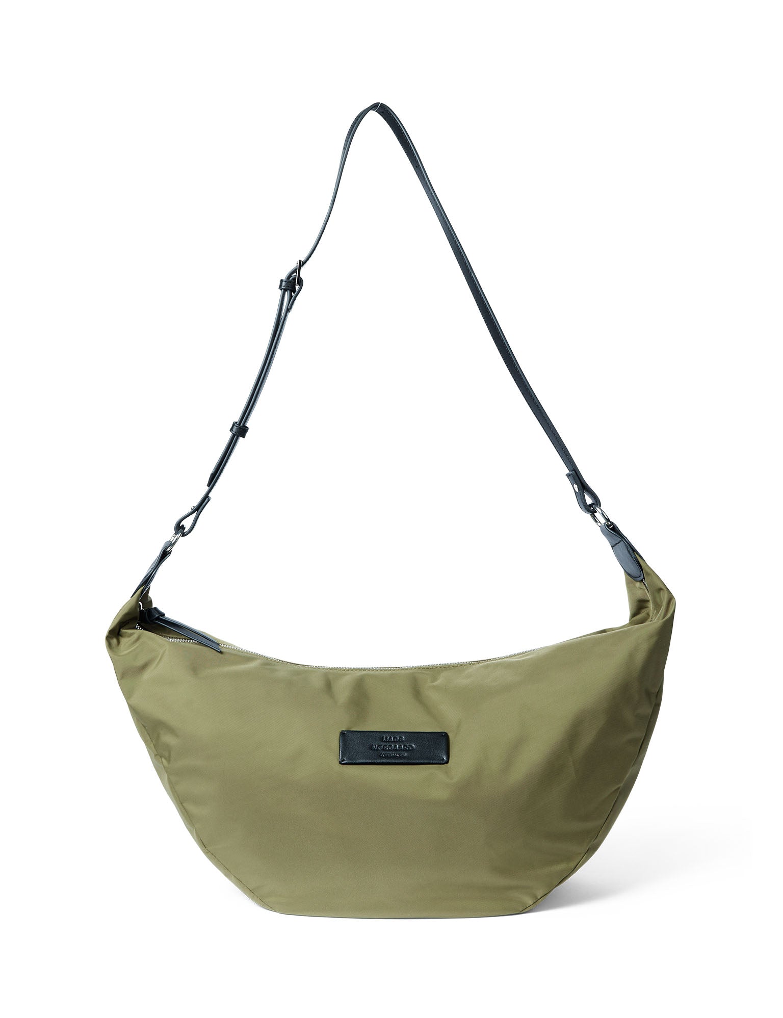 Crossbody bag with a narrow, adjustable strap, zip closure, inner pocket and all-black logo label.