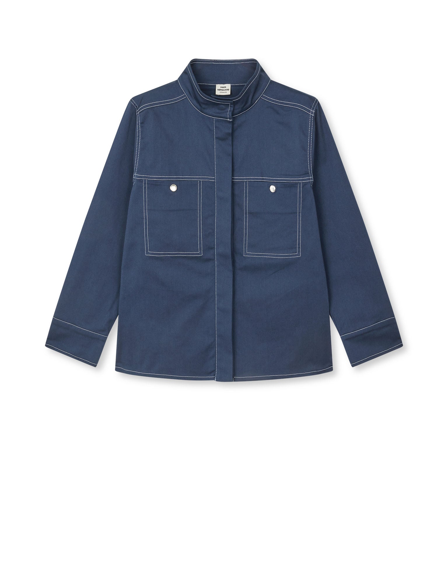 The Twilla Joanne is a supercargo jacket with a boxy big-shirt shape, large pockets, visible stitching, wide cuffs and a Mandarin collar.