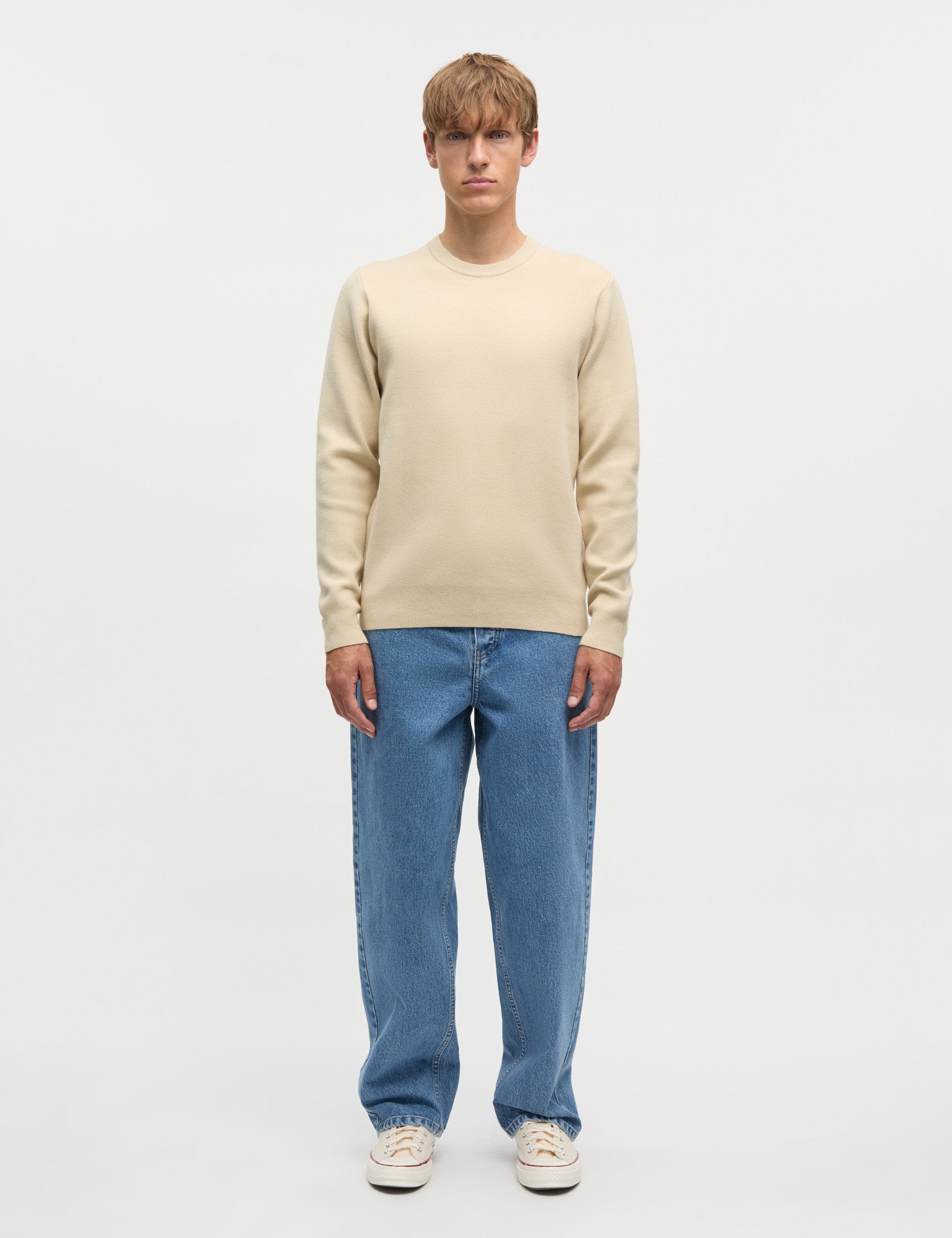Smooth and simple knitted jumper with a round neck and rib-knit trim.