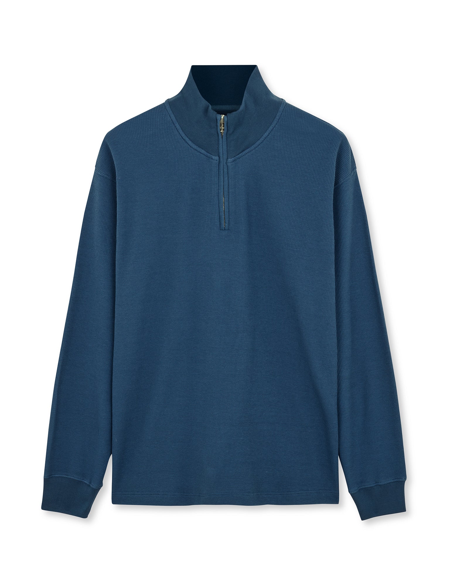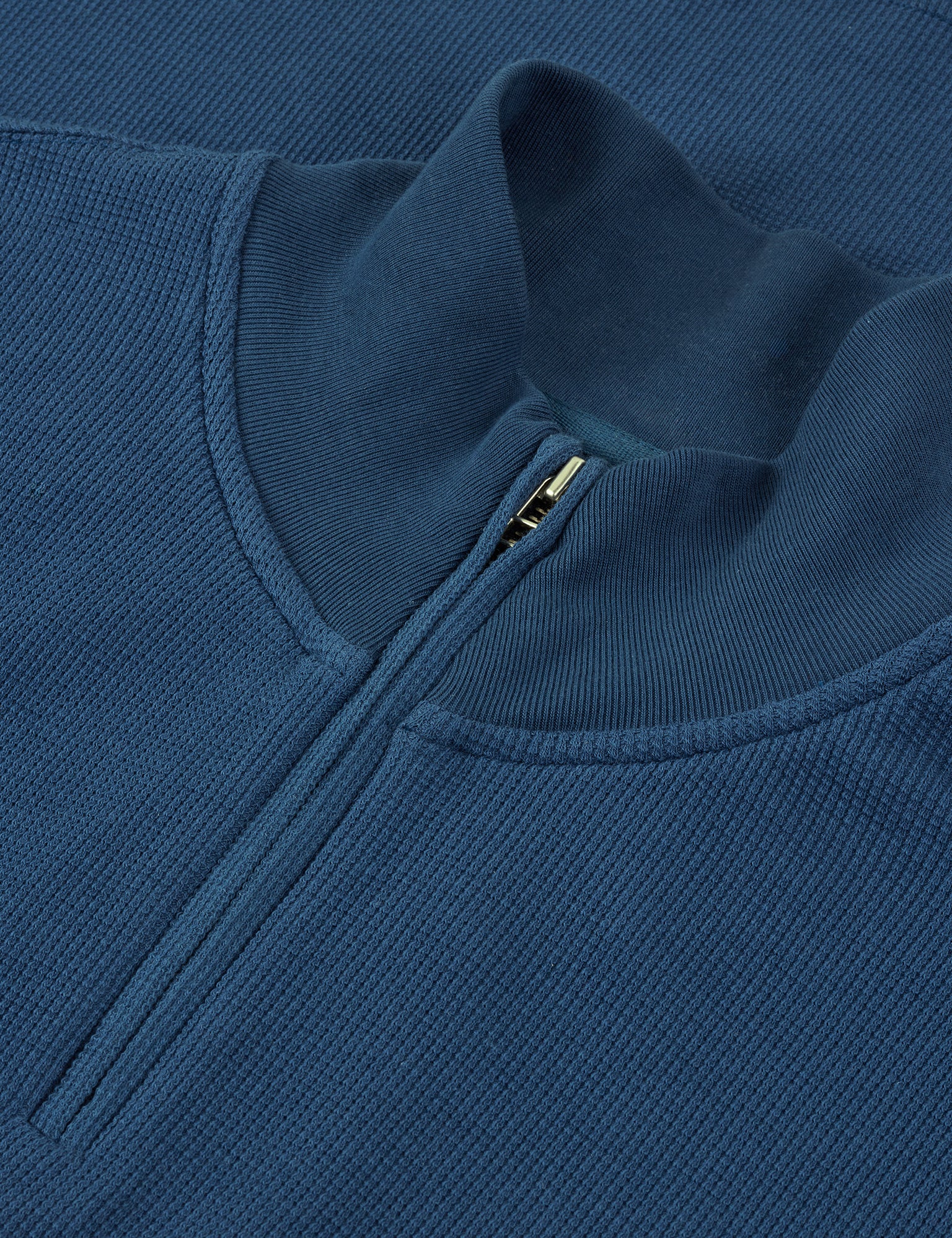 Our sweatshirt Waffle Swindon Sweat is made of 100 % cotton that is woven into a waffle structure. The fit is regular, the shoulders are slightly dropped and the neck is tall with a zipper.