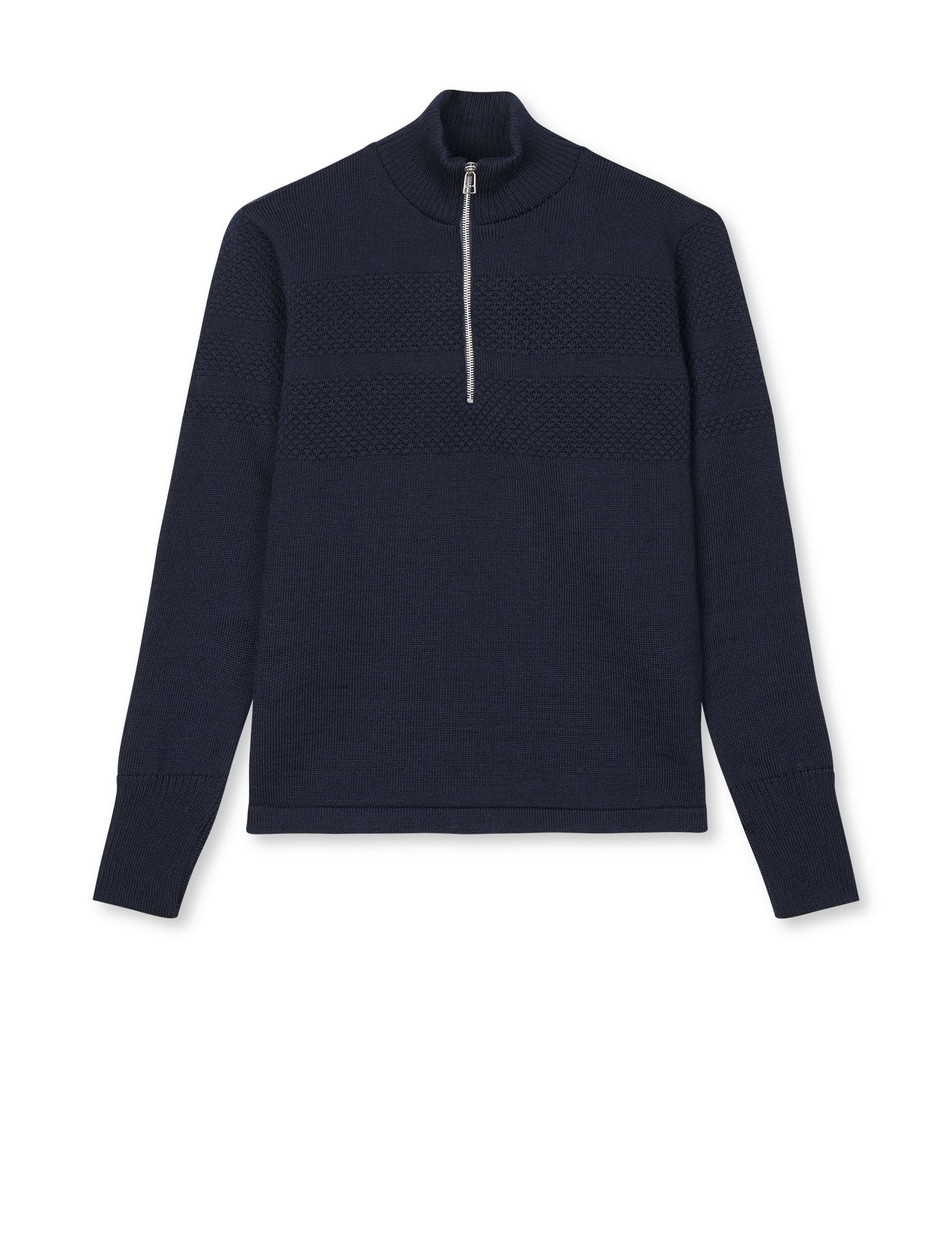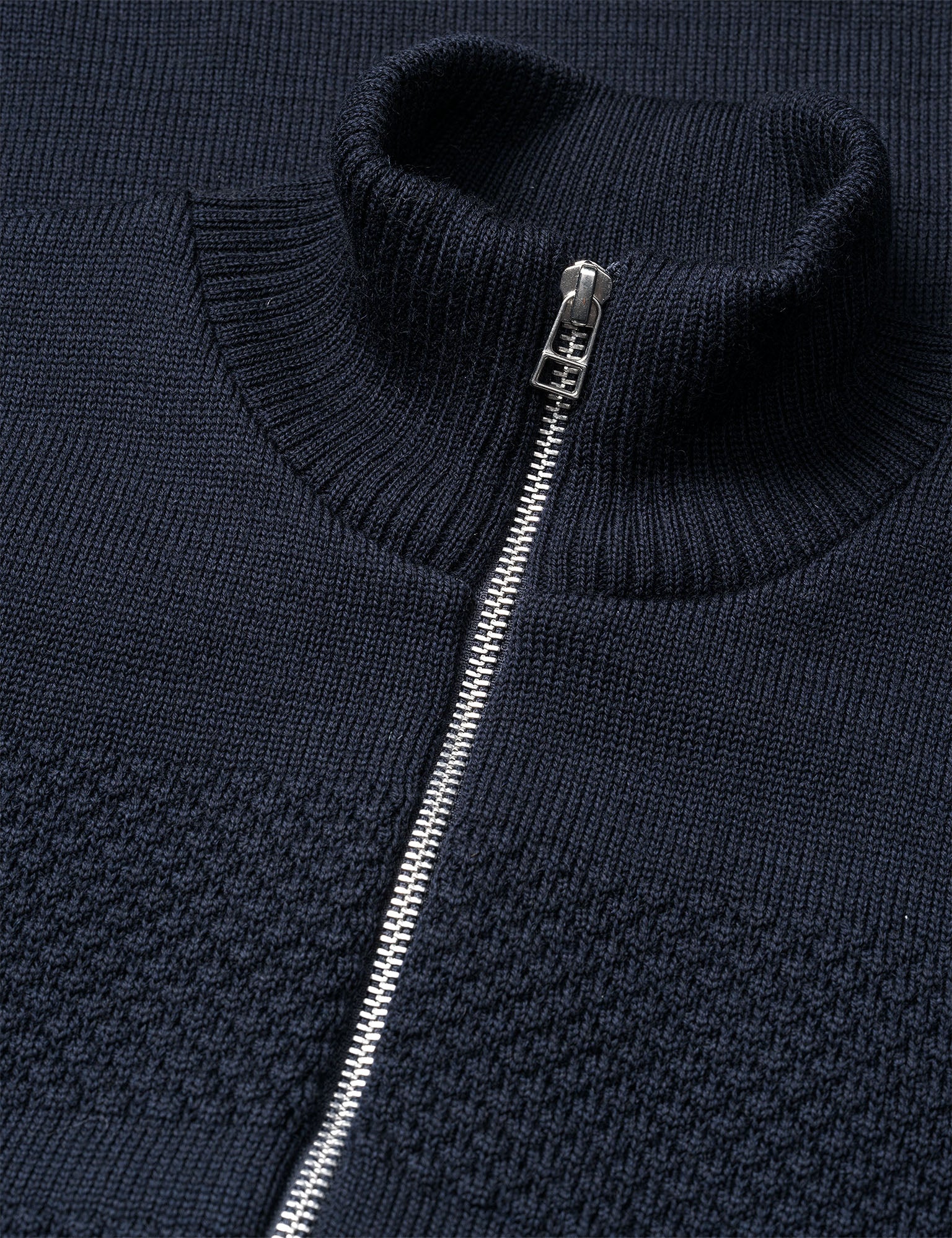 Chunky sailor knit with a zip to mid-chest, high neck and long cuffs with fold-over.