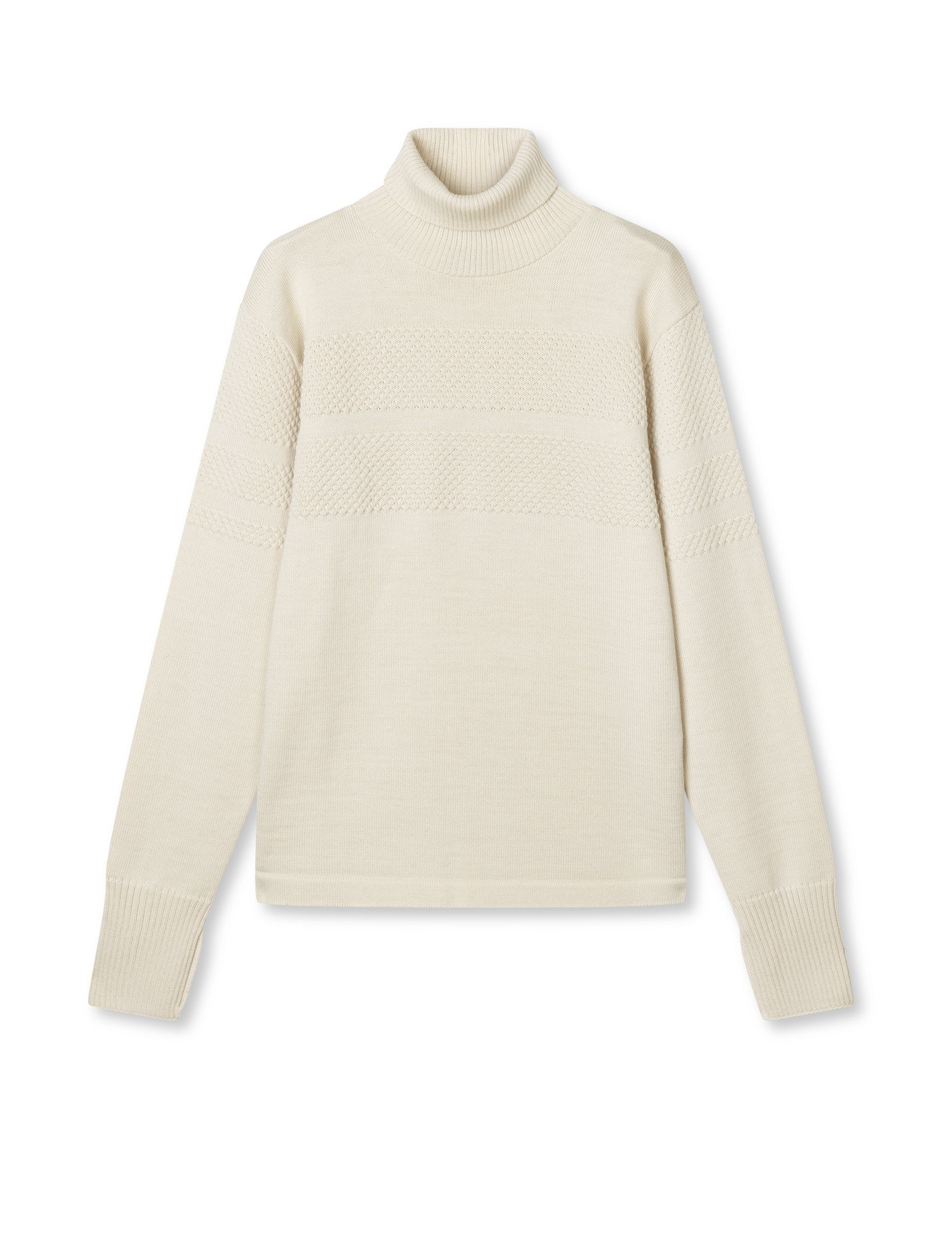 Our all time classic, the knitted sweater Wool Klemens Knit, is made of 100 % wool. It is densely knitted, it is heavy and it is really warm. The edges are rib knitted, the neck is high, the fit is tight and the style is sailor.
