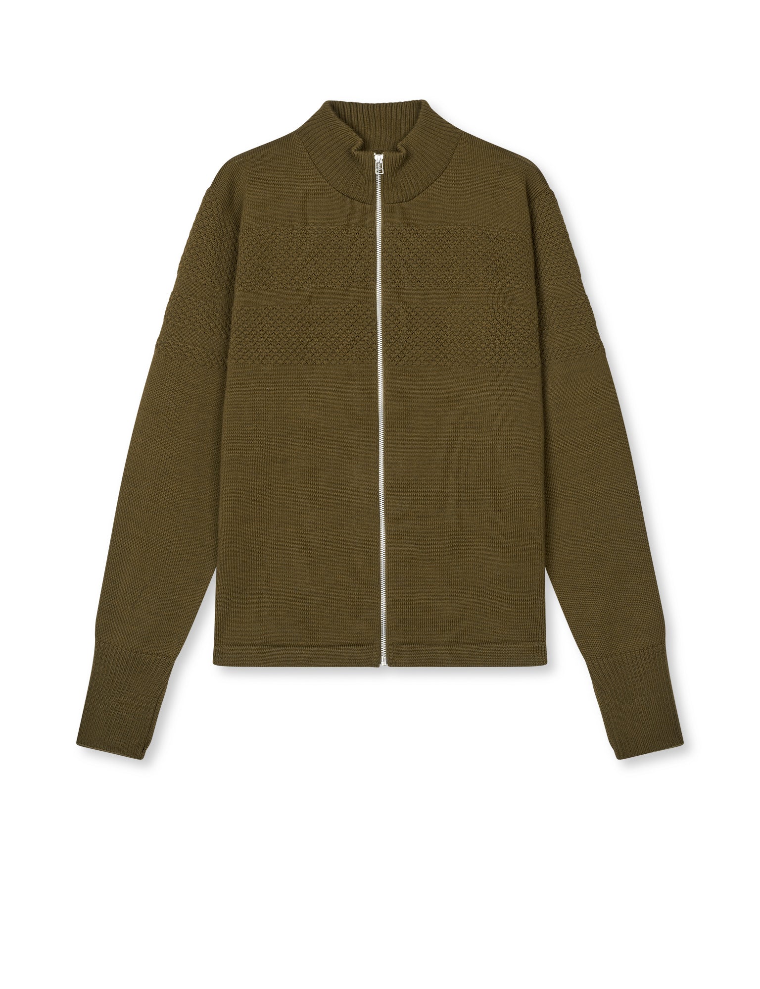Our all time classic, the knitted cardigan Wool Klemens Zip Knit, is made of 100 % wool. It is densely knitted, it is heavy and it is really warm. The edges are rib knitted, the neck is high, the fit is tight and the style is sailor.